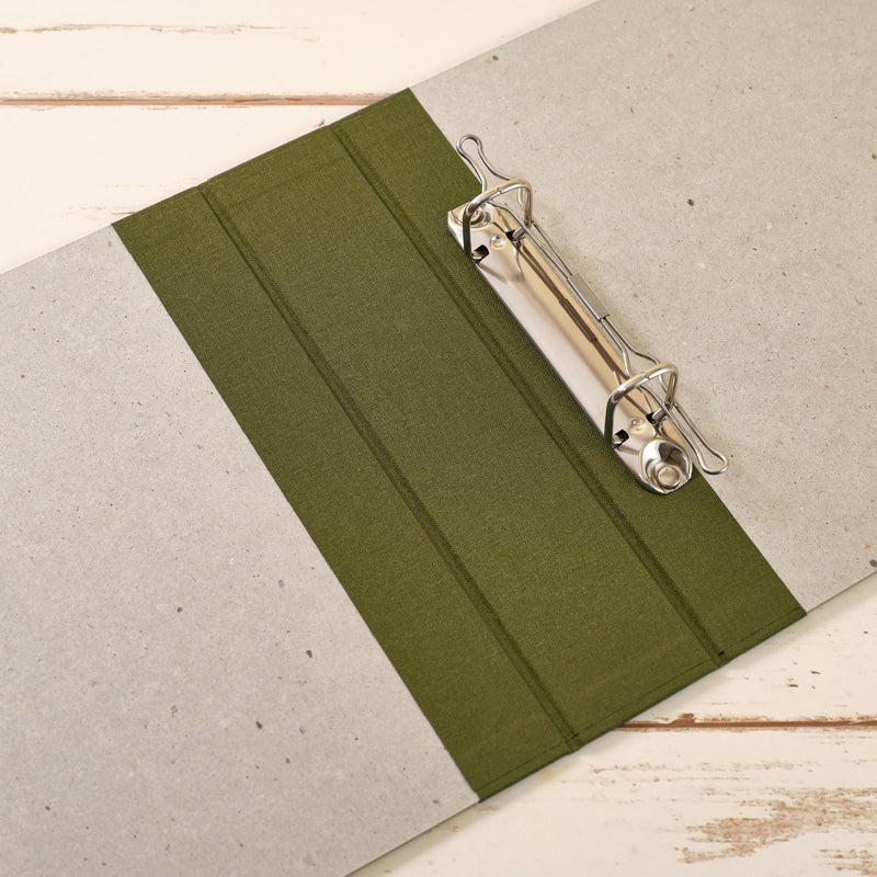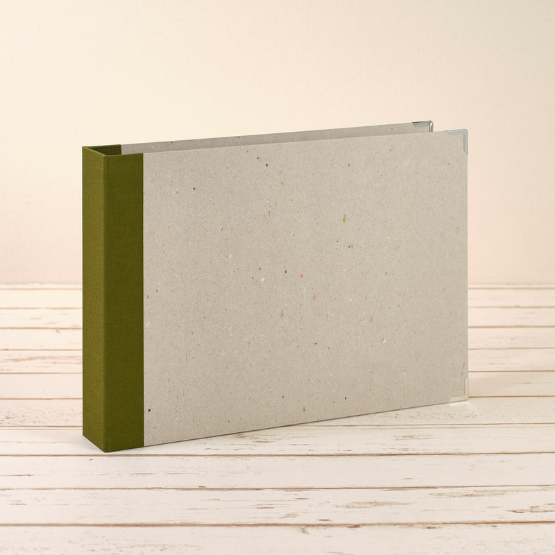 ohne Inhalt | frz. Buchbinderpappe mit Leinenstoff halbbezogen | 33 x 23 x 5 cm (BxHxT) | A4 Querformat | Füllhöhe: 25 mm | Füllmenge: ca. 100 Blatt (160 g Naturpapier) oder 130 Blatt (100 g Papier) | 2er Lochung | Buchecken |  Niederhalter aus Metall | ohne Kunststoff/Plastik