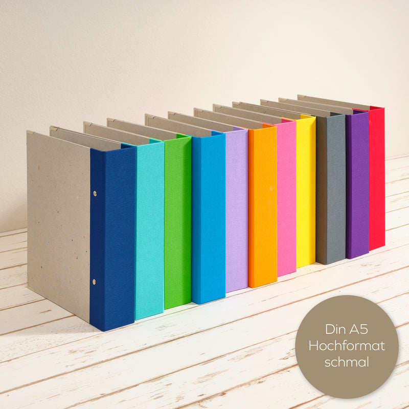 ohne Inhalt | frz. Buchbinderpappe mit Leinenstoff halbbezogen | 20,5 x 23 x 5 cm (BxHxT) | A5 | Füllhöhe: 25 mm | Layflat: liegt in geöffnetem Zustand flach | 2er Lochung | Buchecken | Niederhalter aus Metall | ohne Kunststoff