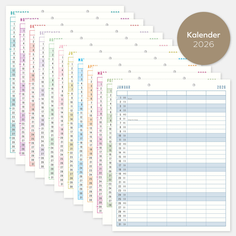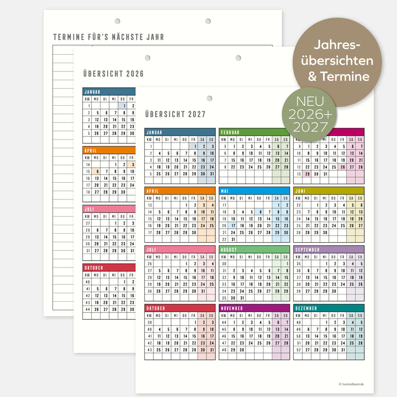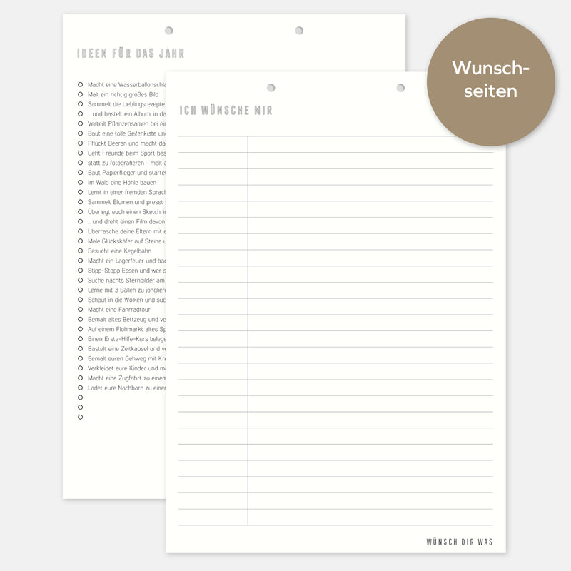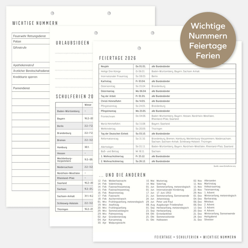 Kalenderseiten mit KW | Feiertage & Festtage | Jahresübersicht | Geburtstagsseiten mit Platz für Geschenkideen | Ferienzeiten in Deutschland & Platz für Urlaubsideen | Terminplaner | Wünsch Dir was Seiten | Ideen für Familienunternehmungen | Wichtige Nummern | 25 leere Notizseiten | Zettelklemme | Stiftehalter