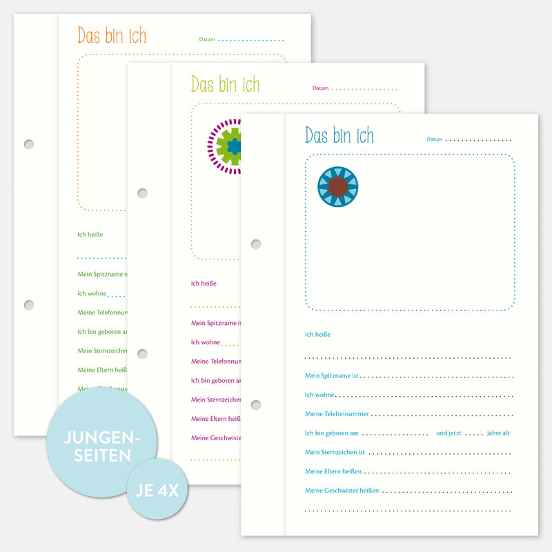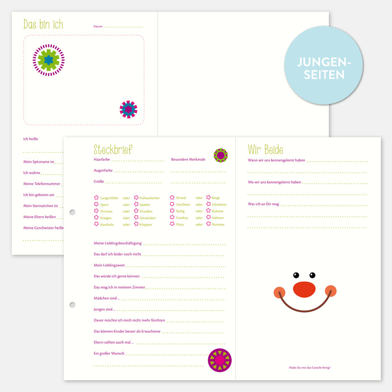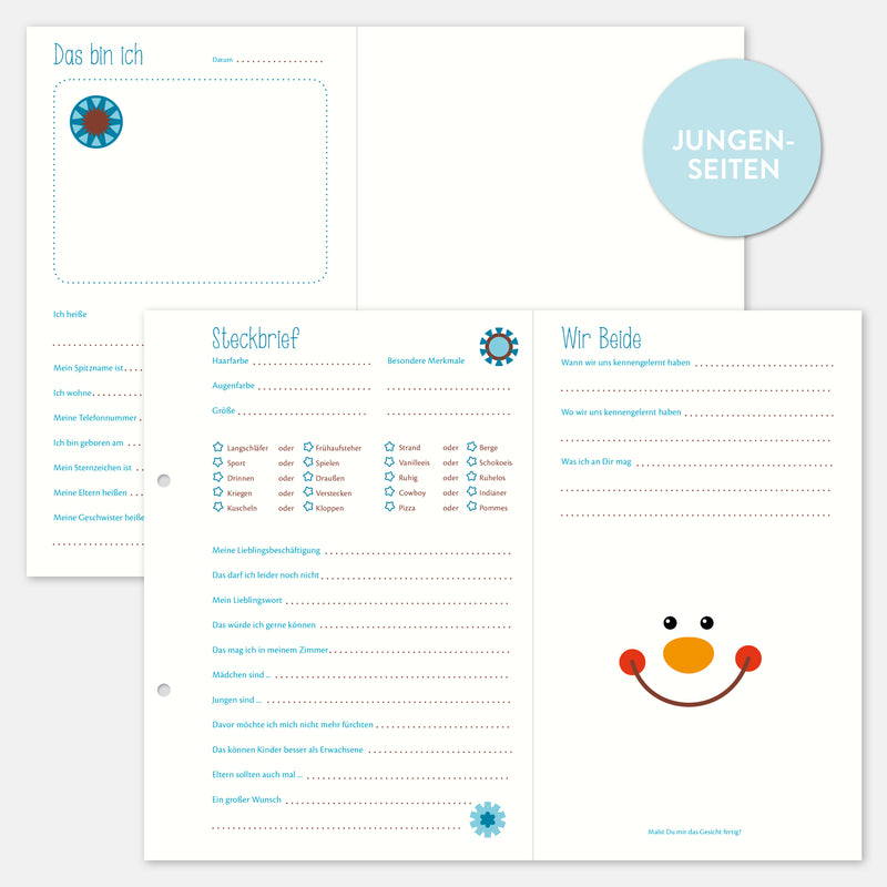 Freundebuchseiten für Jungen ab 6 Jahren ohne Fussball- und Fernsehfragen, mit Clowngesicht zum Weitermalen. Geeignet für A5 Alben mit 2er Lochung.
