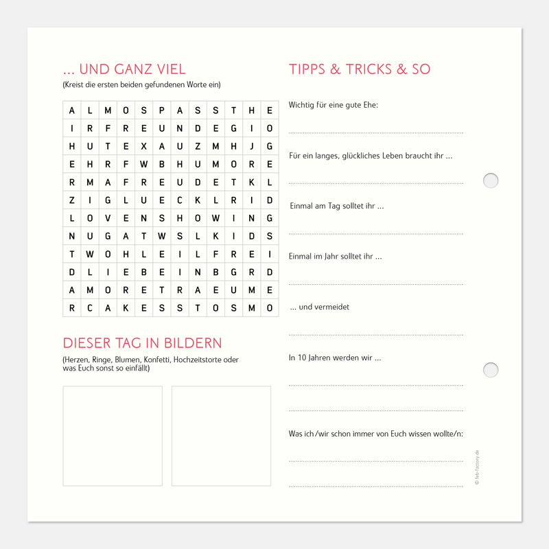 Dazu passend: Blankoseiten für Fotos | Gästeseiten in englisch oder spanisch | Herzseiten (für Kinder zum Ausmalen)