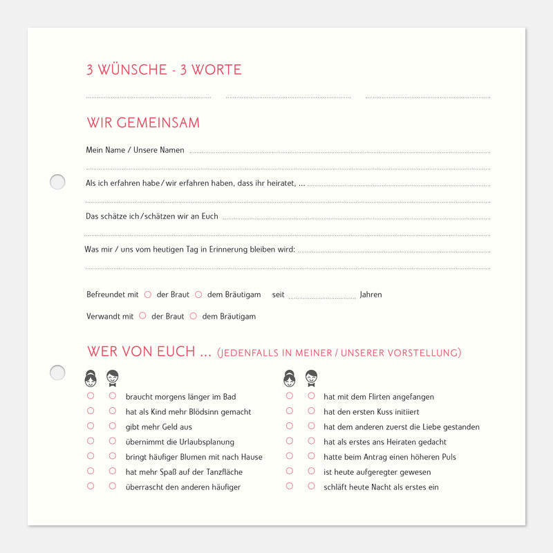 1 Album | 40 Gästebögen (für ca. 65 Gäste) | Begrüßungsseite | Ausfüllbogen 21 x 21 cm | max. 80 Bögen | 8 Albumfarben | 4 Überschriftenfarben