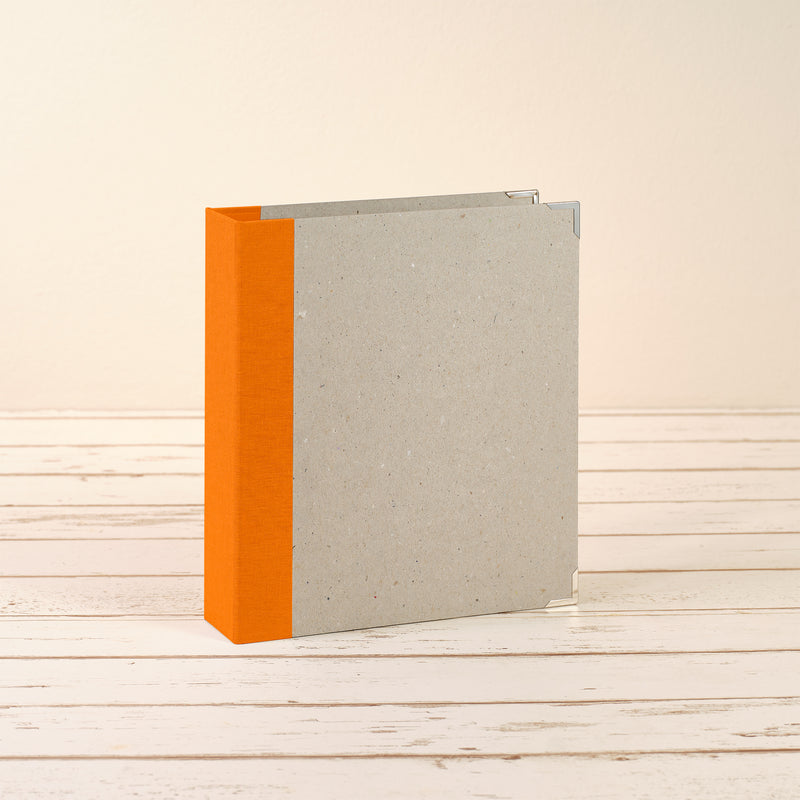 ohne Inhalt | frz. Buchbinderpappe mit Leinenstoff halbbezogen | 20,5 x 23 x 5 cm (BxHxT) | A5 | Füllhöhe: 25 mm | Füllmenge: ca. 100 Blatt (160 g Naturpapier) oder 130 Blatt (100 g Papier) | 2er Lochung | Buchecken | Niederhalter aus Metall | ohne Kunststoff/Plastik