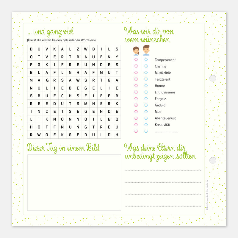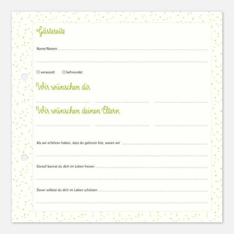 10 extra Gästebögen für das Babytagebuch. 10 Bögen sind in einem Set bereits enthalten.