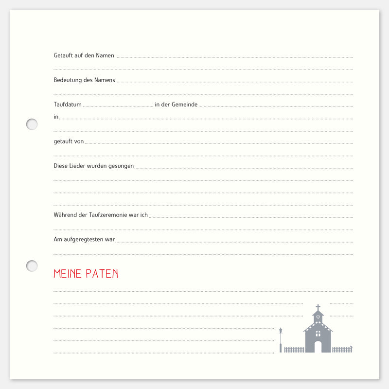 Dank der 2er-Lochung können persönliche Seiten hinzugeheftet werden, z. B. Einladungskarten, Platzkarten, Kirchenblatt, ...